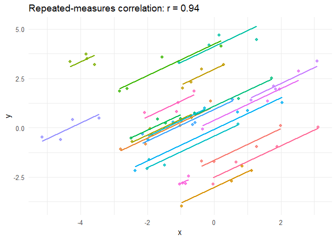 (rmcorr()); agreement tools cover Bland-Altman (two-method