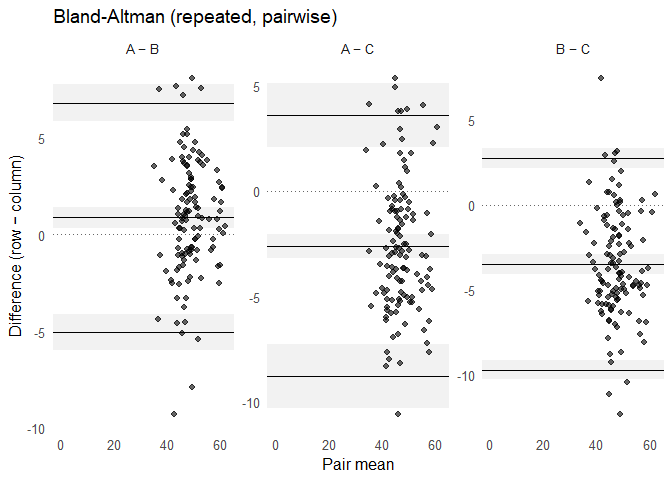 #> Bland-Altman (pairwise), 95% CI